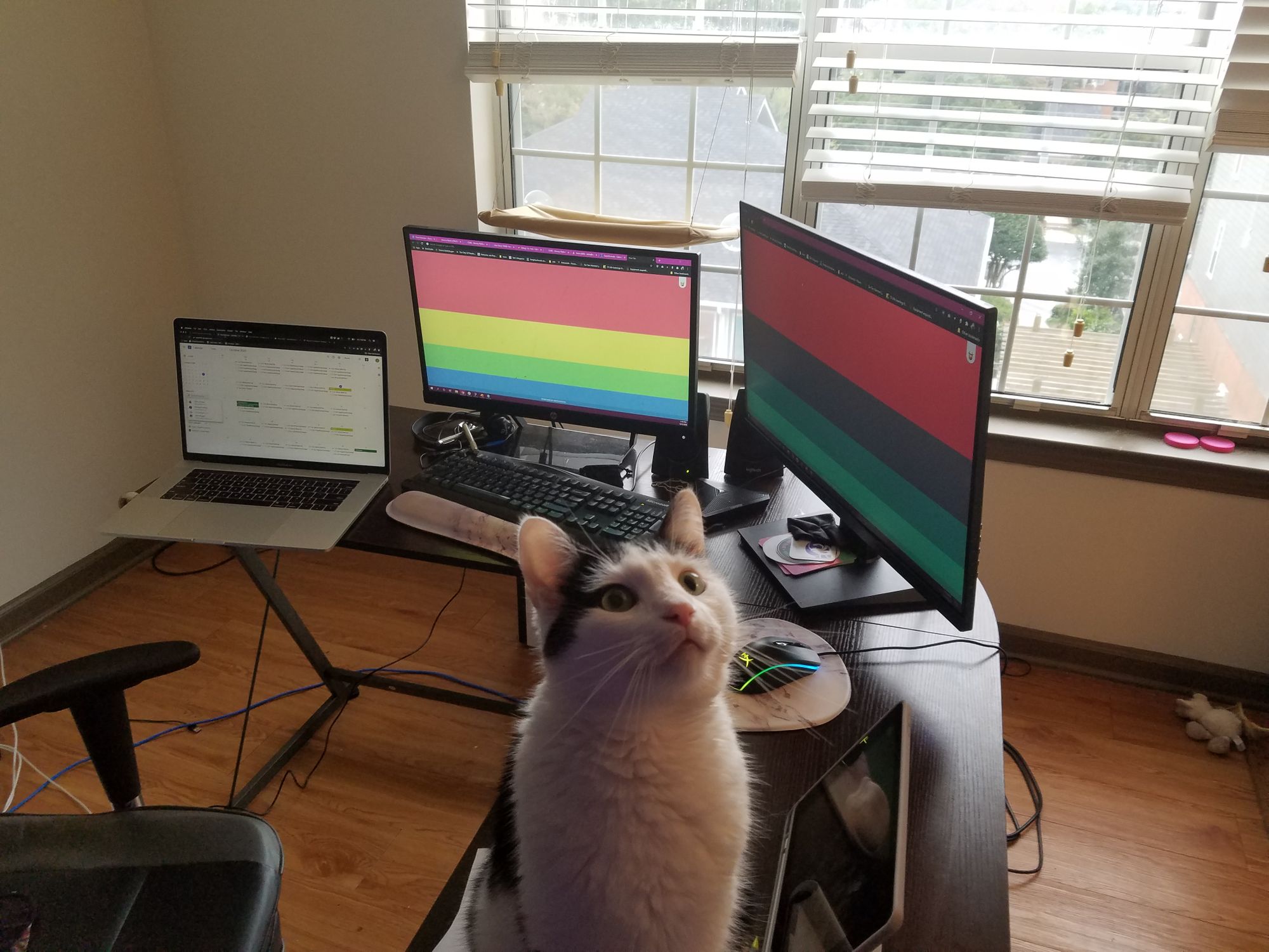 My personal workspace includes a PC, a Mac, pen + paper, and an iPad (for random doodling). My workspace is not complete without my work buddy, Domino 😺.