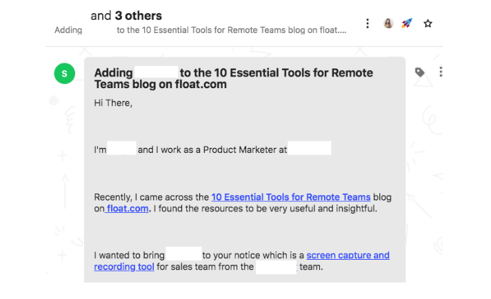 Sometimes what we don’t and wouldn’t do makes for a clear case of our values in practice! For example, we know that backlinks play an important role in SEO and we (like most marketers) want to acquire as many quality backlinks as possible for our site. However, we haven’t engaged with agencies or freelancers who bulk send backlink requests on behalf of clients. Why not? The screenshot below is one of countless emails we receive from other brands. This non-personalized, copy and paste communication isn't something we'd ever want to put our own name to or ask of other brands. Even for a link.