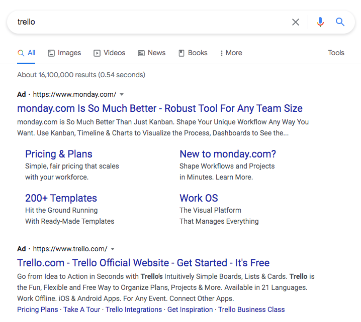 Take this example from Monday.com explicitly targeting their competitor Trello’s brand name search with paid advertising.