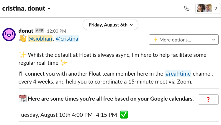 We have Donut integrated with Slack, and every four weeks, it connects us with one other Float team member at random to schedule a 15-minute catch-up. We find that most of the Donut chats go on for way longer than 15 minutes, but, ultimately, it's the team who is driving this.