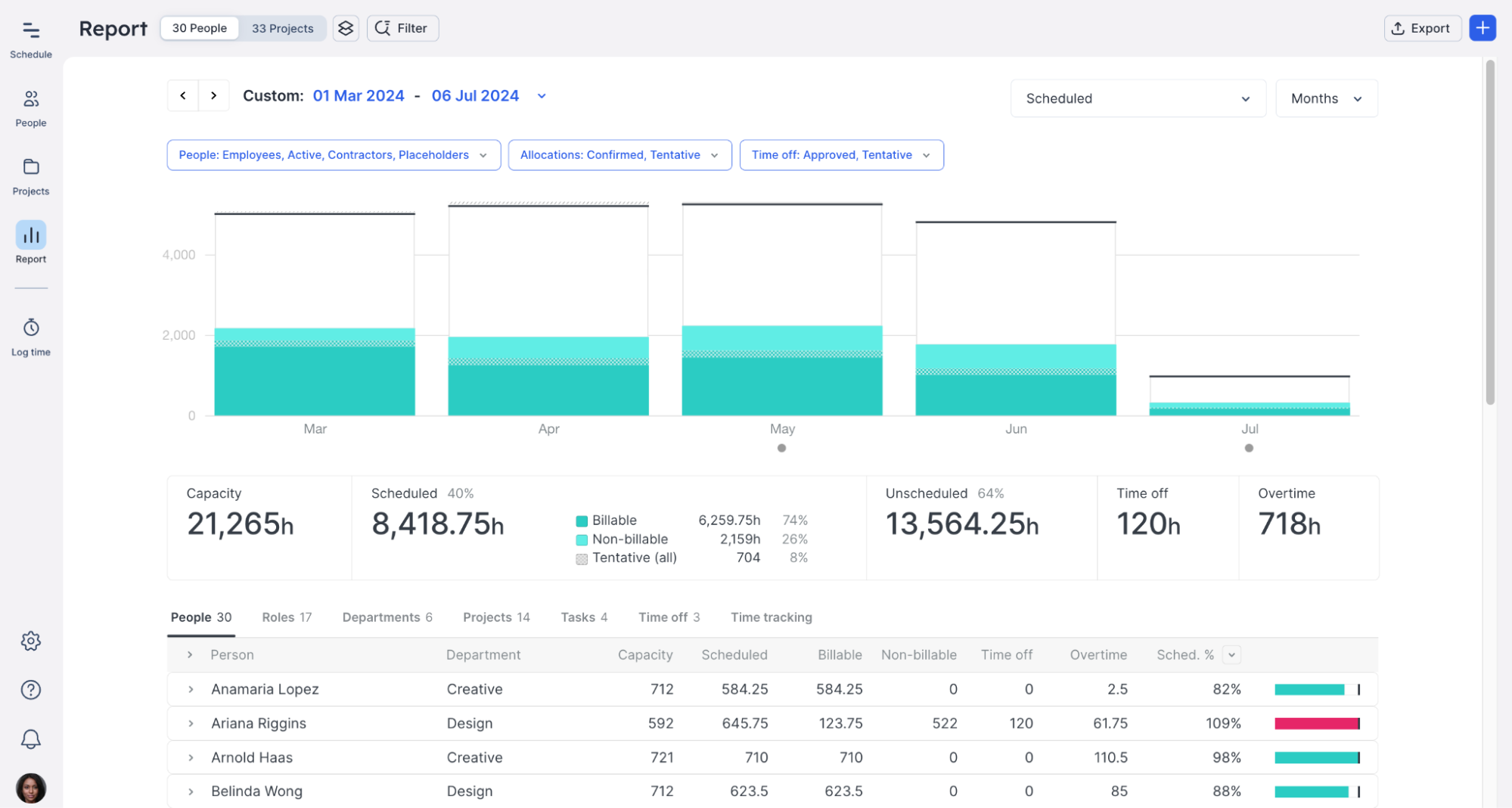 Visual and easy to understand, the People report in Float gives you filtered views of all the essential data about your team’s capacity