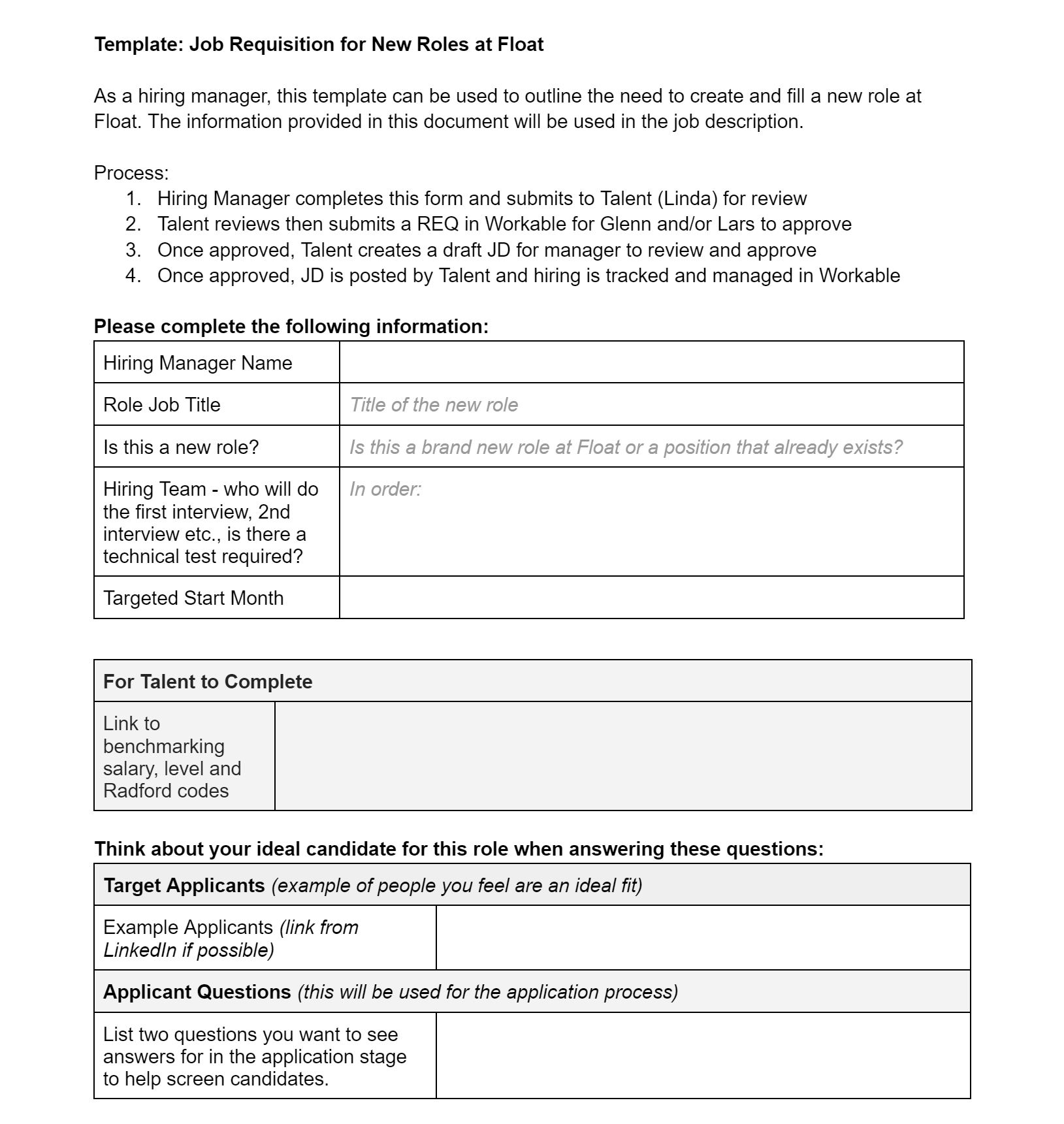 We developed a job requisition template to support managers and create a more streamlined and consistent process for each role. It provides all the questions our talent, people & operations team needs answers to and examples of how to think about communicating the information. It’s not rocket science, and the template certainly isn’t fancy. Still, it allows us to support a very busy and high hiring velocity down the pipeline that would otherwise be tedious and unclear internally.