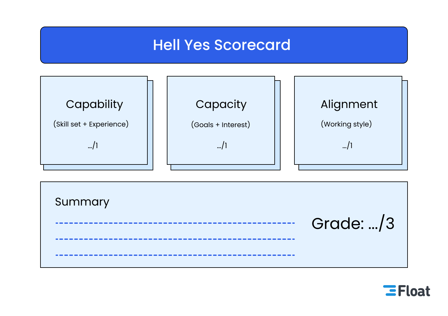 We developed a hiring scorecard called our hell yes metric to do better. It looks at three key areas: capability (skill set), capacity (goals), and alignment (values + mindset + working style). It’s not enough to have functional fit—what we look for in terms of previous relevant experience and education—we also believe that value alignment is just as important in setting people up for success at Float.