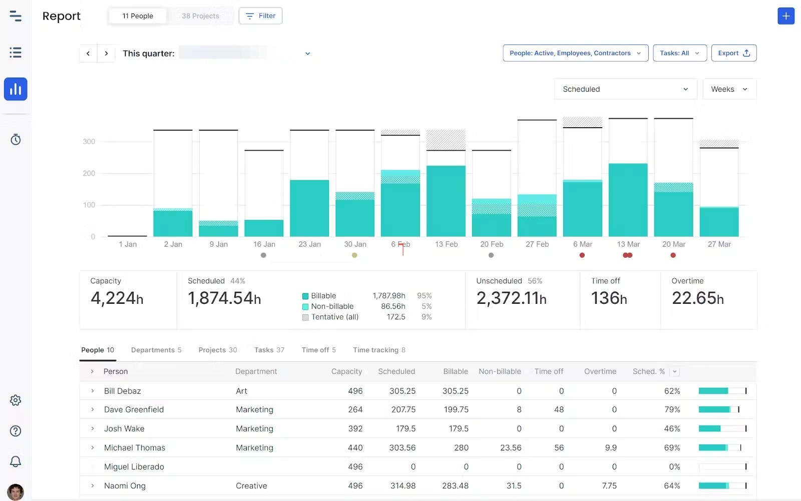 Using software for resource management simplifies (and speeds up) the process of maintaining favorable capacity levels. Float does the heavy lifting by calculating your resources based on their total available hours (for both FT and PT capacity). It also generates reports to see all the numbers behind your team.
