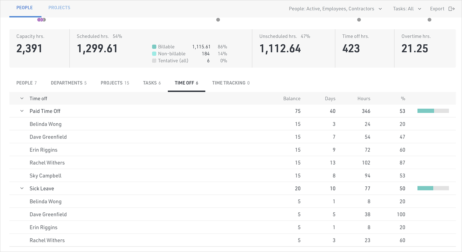 With Float, you can check the total leave balance for FTE or PTE employees using the time off policies feature. You can view the unused balance as a whole number or percentage for on-the-fly planning.