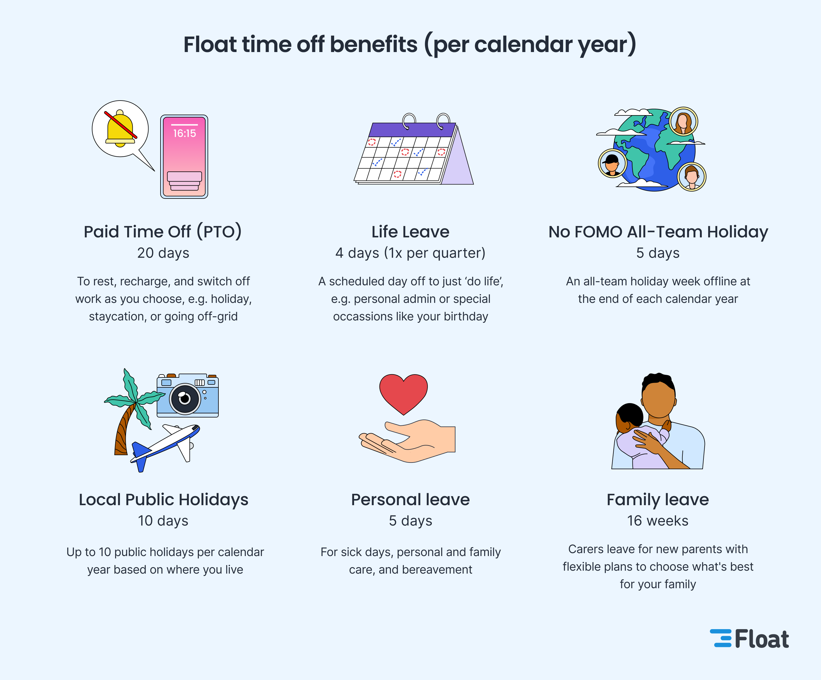 - Enablement: Systems that ensure your team is fully supported be offline in their non-work time. At Float, our managers all buy-in to their team using all of their leave by planning ahead and considering the bigger picture of who's affected when someone is away. As individuals, we all take responsibility for helping each other plan around our time off. We also design our policies to be sustainable, in that we don’t write checks we can’t cash, e.g., we don’t offer so much PTO that when all of the available leave is actually used, we can no longer run a profitable and productive business. This is one of the reasons why we haven’t implemented a 4 day work week.
