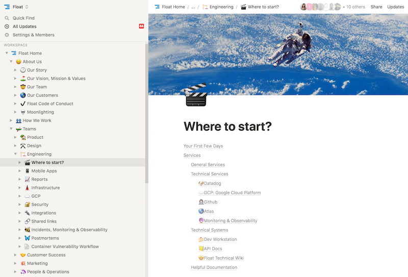 Our internal tools and processes help us work efficiently and effectively. Self-service documentation is critical in a remote, asynchronous working environment where it’s not possible to just tap someone on the shoulder to ask a quick question, or ping a teammate on Slack at 3 a.m. and expect a reply. What I love about our documentation style at Float is that self-service means that anyone can pick it up and know what they’re reading and where it stands. It’s also a key part of our onboarding process. Check out how schmick our engineering documentation is looking in Notion for new team members!