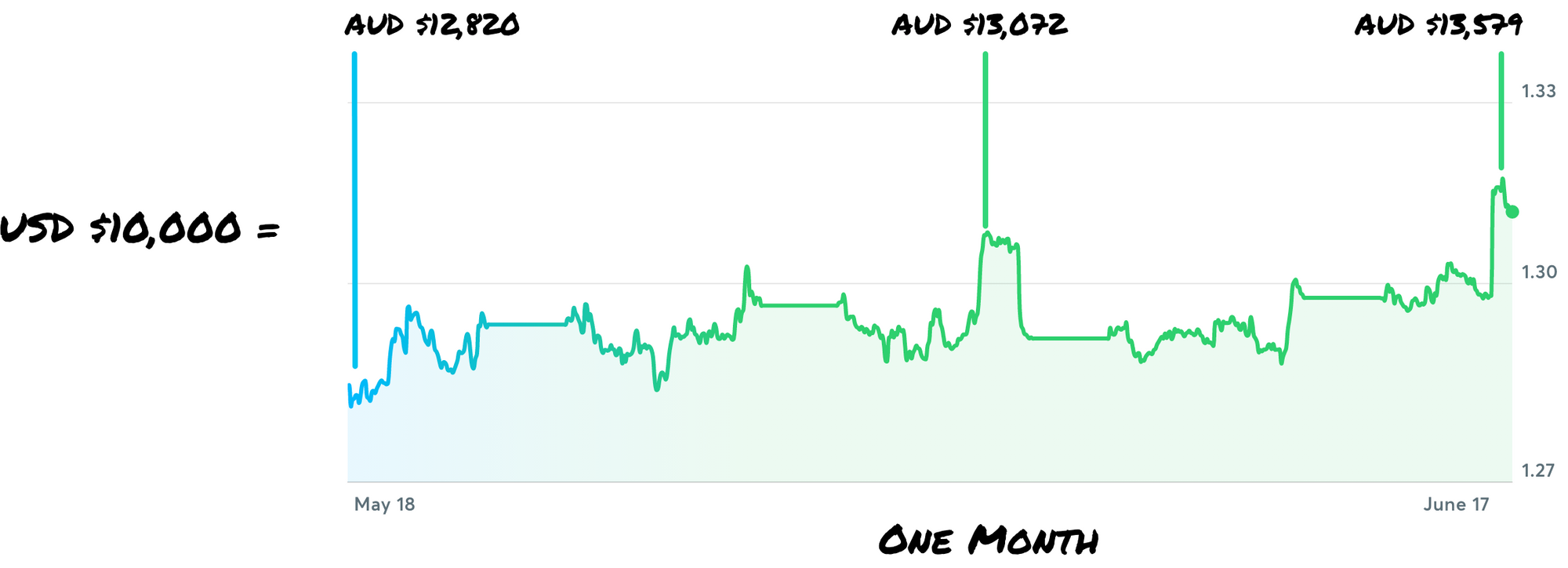 Let's say that Sarah lives in Melbourne, Australia, and earns $10,000 USD per month working at Float. Depending on the day her payment was processed last month, Sarah may have lost up to $759 as a result of exchange rate fluctuations. Her income could end up being 6% less based on factors that are completely out of her control!