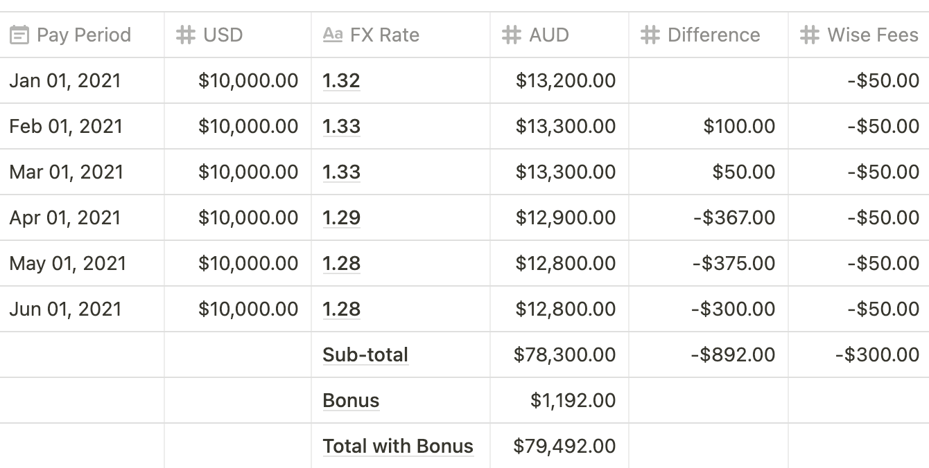 At the end of June, Sarah has accrued a negative balance of $892 and Wise fees of $300 for the last 6 pay cycles. Our make good exchange rate bonus will see that she receives an extra $1,192 in her next paycheck!