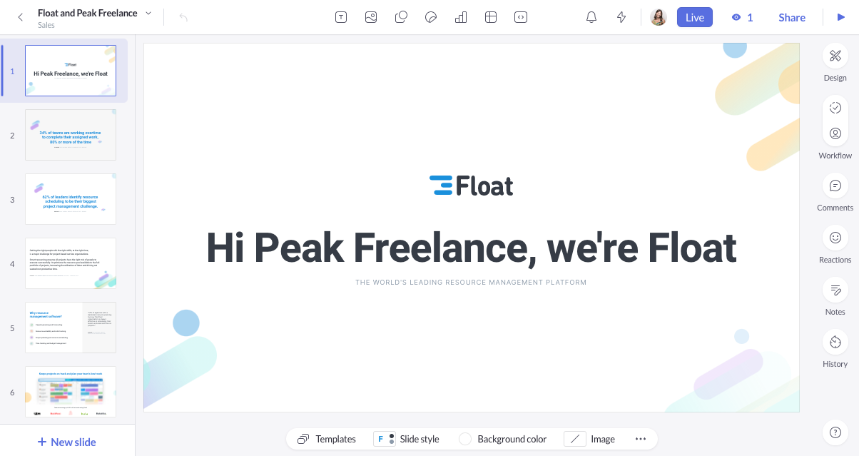 - Sending client presentations via Pitch. Late last year, I proposed the need for a presentation template that I could personalize and send to prospective Float customers. Our CEO, Glenn, suggested we try Pitch, a cloud-hosted and collaborative presentation tool. I worked with our Director of Marketing, Siobhan, to sharpen the story and brand message, and our Senior Design Lead, Cam, to design a unique Float branded template that could be personalized to each client. We've had great success with creating and sharing these presentations with customers and loved the Pitch tool so much that we now use it for our quarterly all-hands and new team member onboarding!