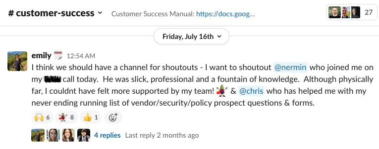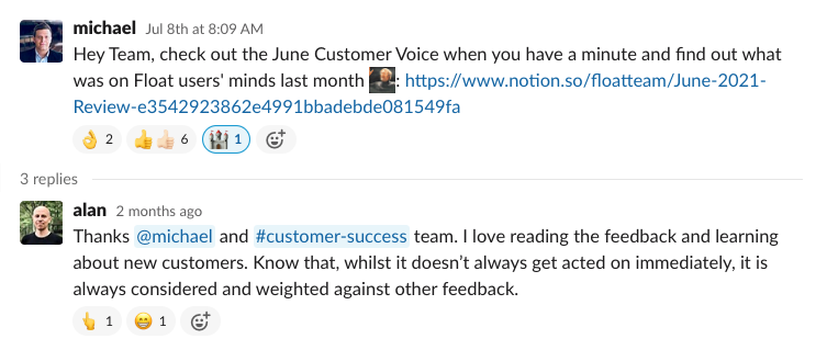 - #customer-success Slack channel: We have a dedicated #customer-success channel on Slack that the entire Float team is a part of. We're able to share what's happening within our department, and can reach out to others with questions or (even better) relevant updates that support us to work smarter.