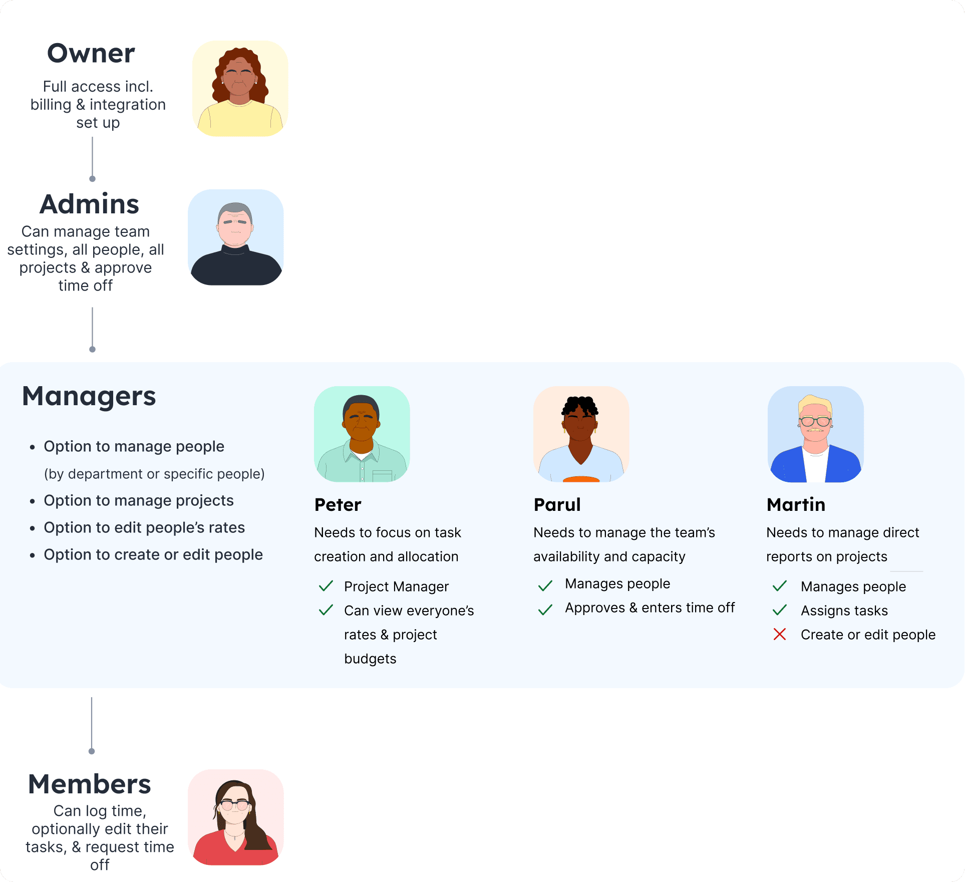 We’re combining project and department manager access into a single Manager role—with personalized permissions that provide clarity around who manages what within your team. Additionally, people managers can now approve time off requests for team members who report directly to them.