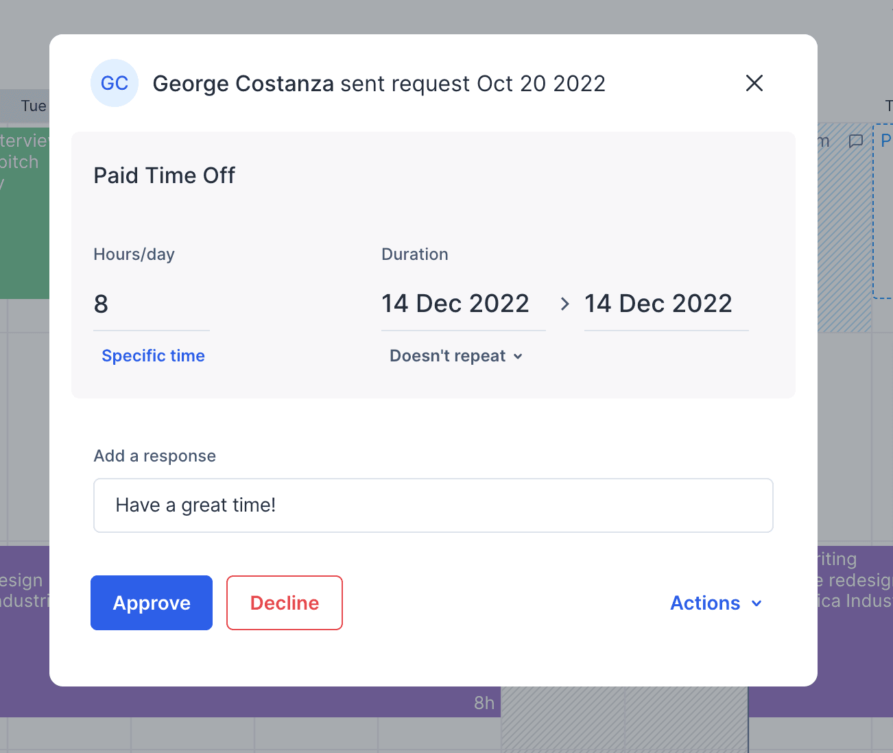 This lets your team plan time off in the same place they plan work—providing one source of truth of your team’s time.