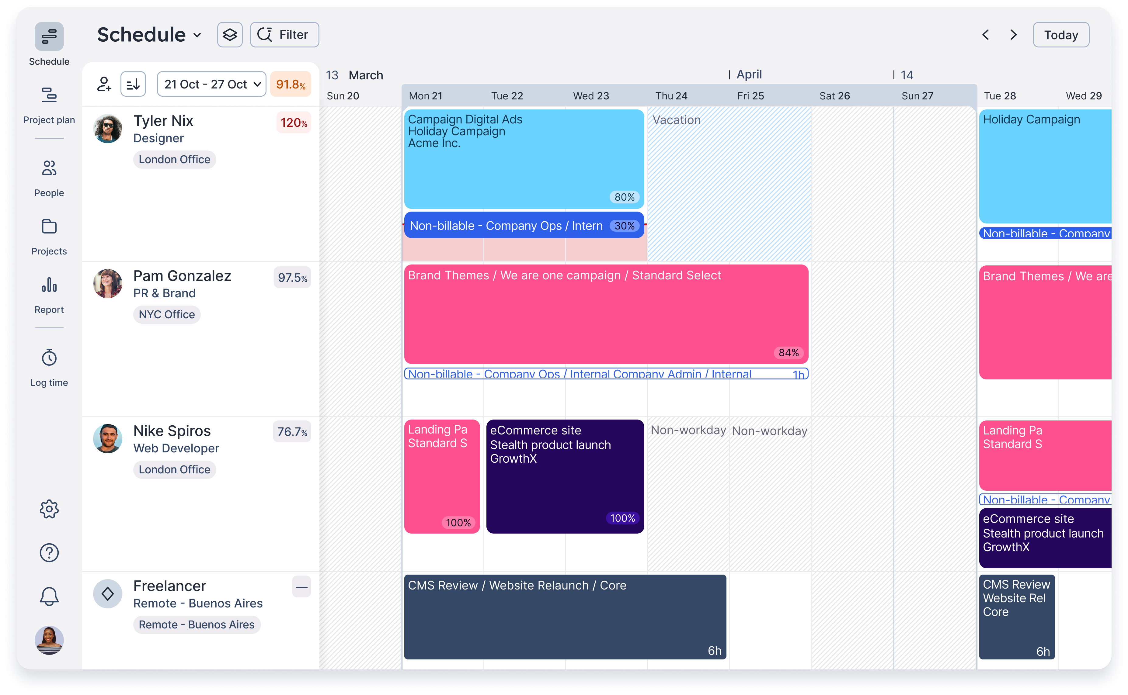With Float, everything is implemented either within the platform or seamlessly via the API, which Metalab's team uses to connect Float with their HR system. It means teams across the business can immediately see real-time availability, time off, working hours, and much more within Float.