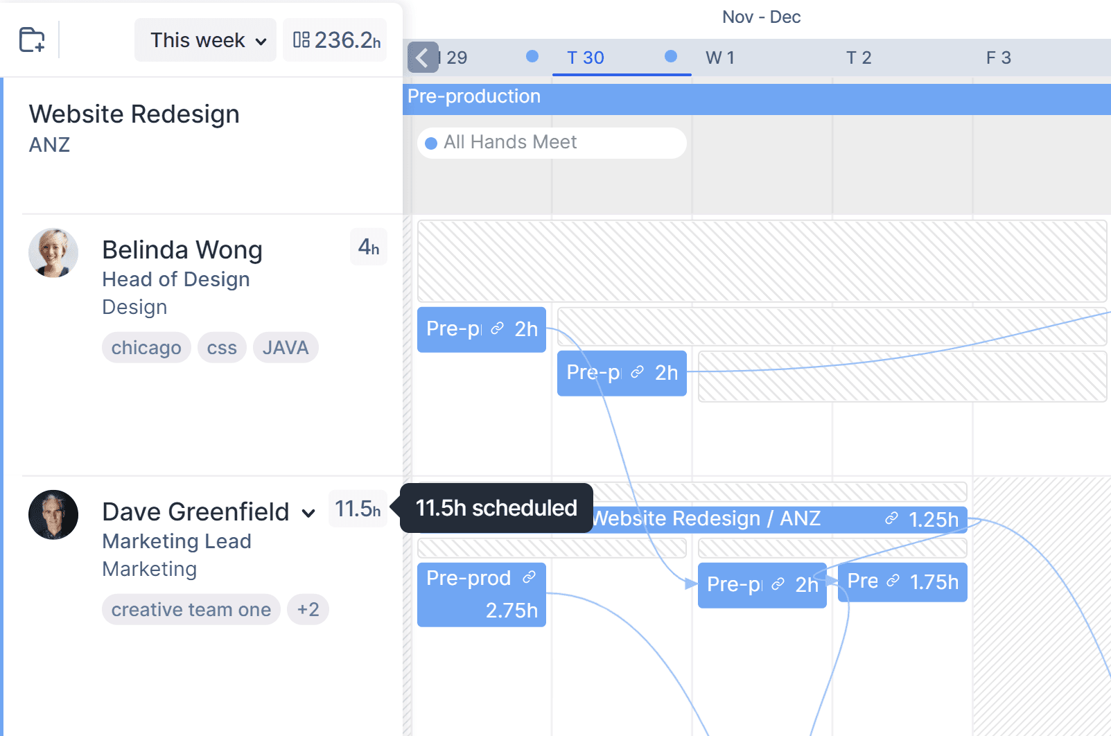 Hovering over a person's unscheduled hours also reveals their scheduled time for the date range.