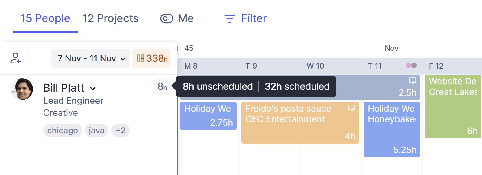 In the People view, each person's unscheduled hours display next to their name, and your team's total remaining capacity is shown next to the date range at the top.