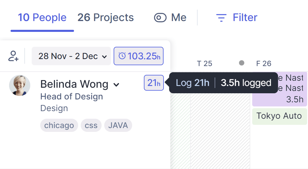 Hovering over a person's unlogged hours will also reveal how many hours they've already logged for that date range.