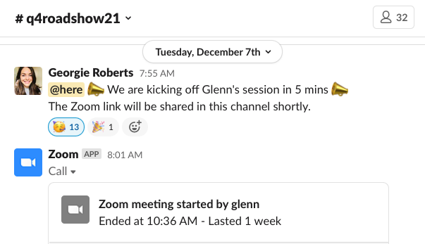 3. A notification was triggered in the channel a few minutes before each session started. We used @here in Slack which notifies only members who are online.