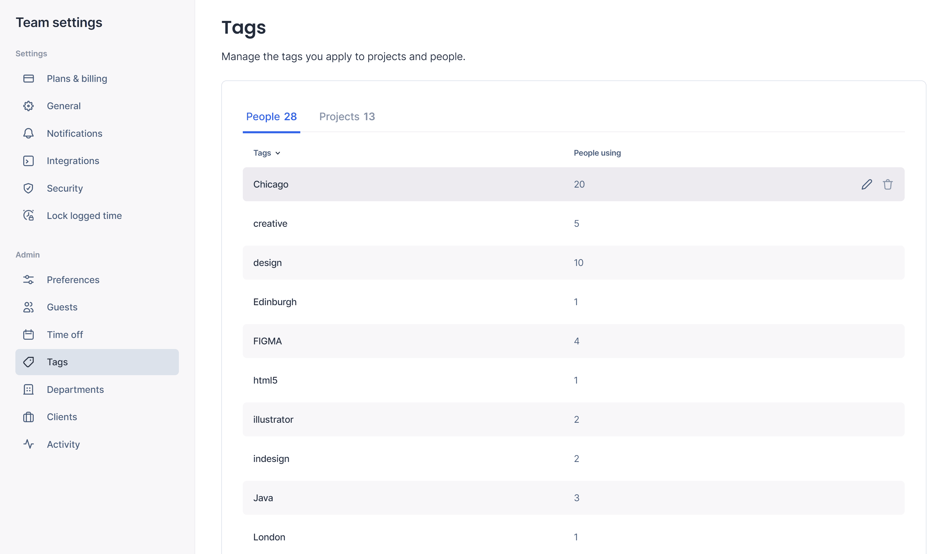 We've also added a new tags page within the Team settings to help you manage your existing people and project tags more effectively. The Account Owner, Admins, and Department Managers can edit tag names, correct spelling mistakes, and delete tags that are no longer needed.