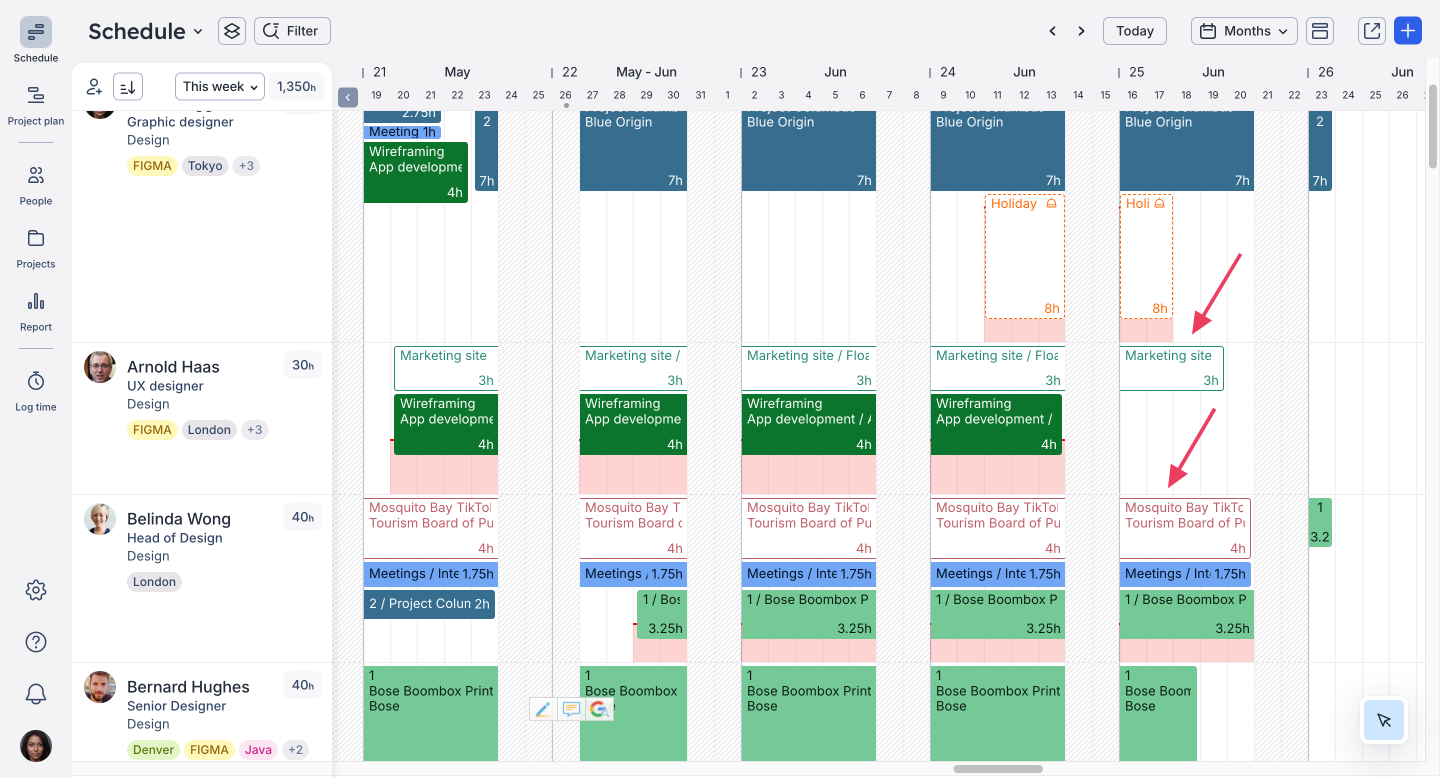 You can also determine if you should take on a project by looking at the work your team is currently doing and their future capacity in Float.