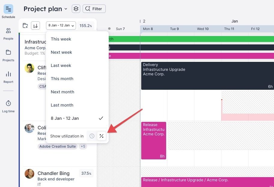 - What it involves: people planners track utilization to determine how much of an individual’s time is billed to a client. (Pro tip: a healthy utilization target should account for internal meetings, sufficient context-switching time, and a realistic number of projects.)