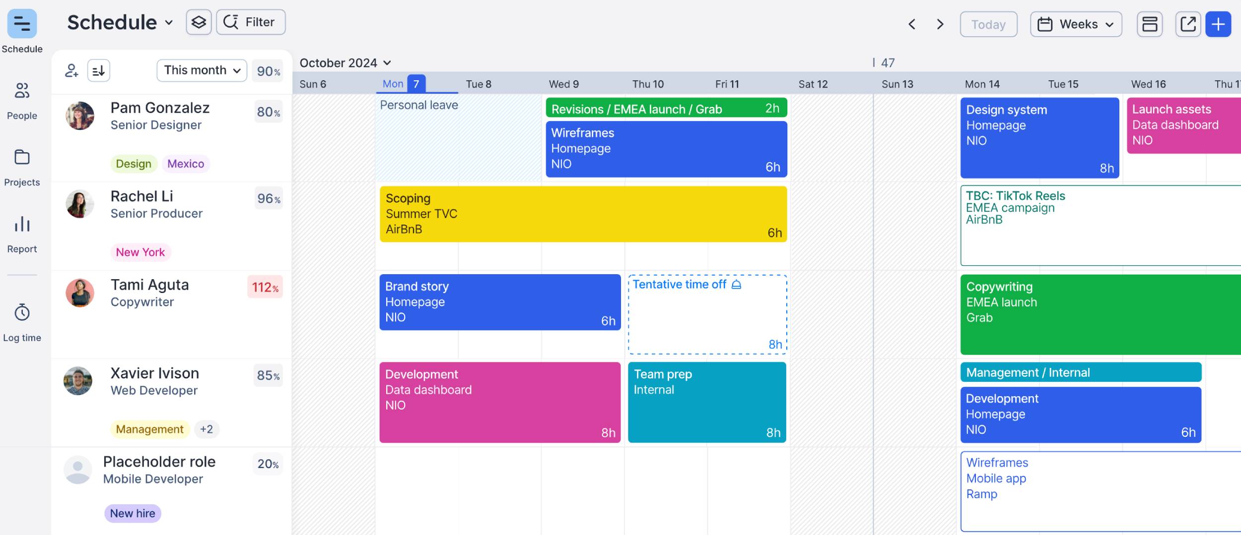 In this way, a resource schedule is your org’s central hub, where team members can go to get a broad overview of how everyone’s time is spent. This includes: