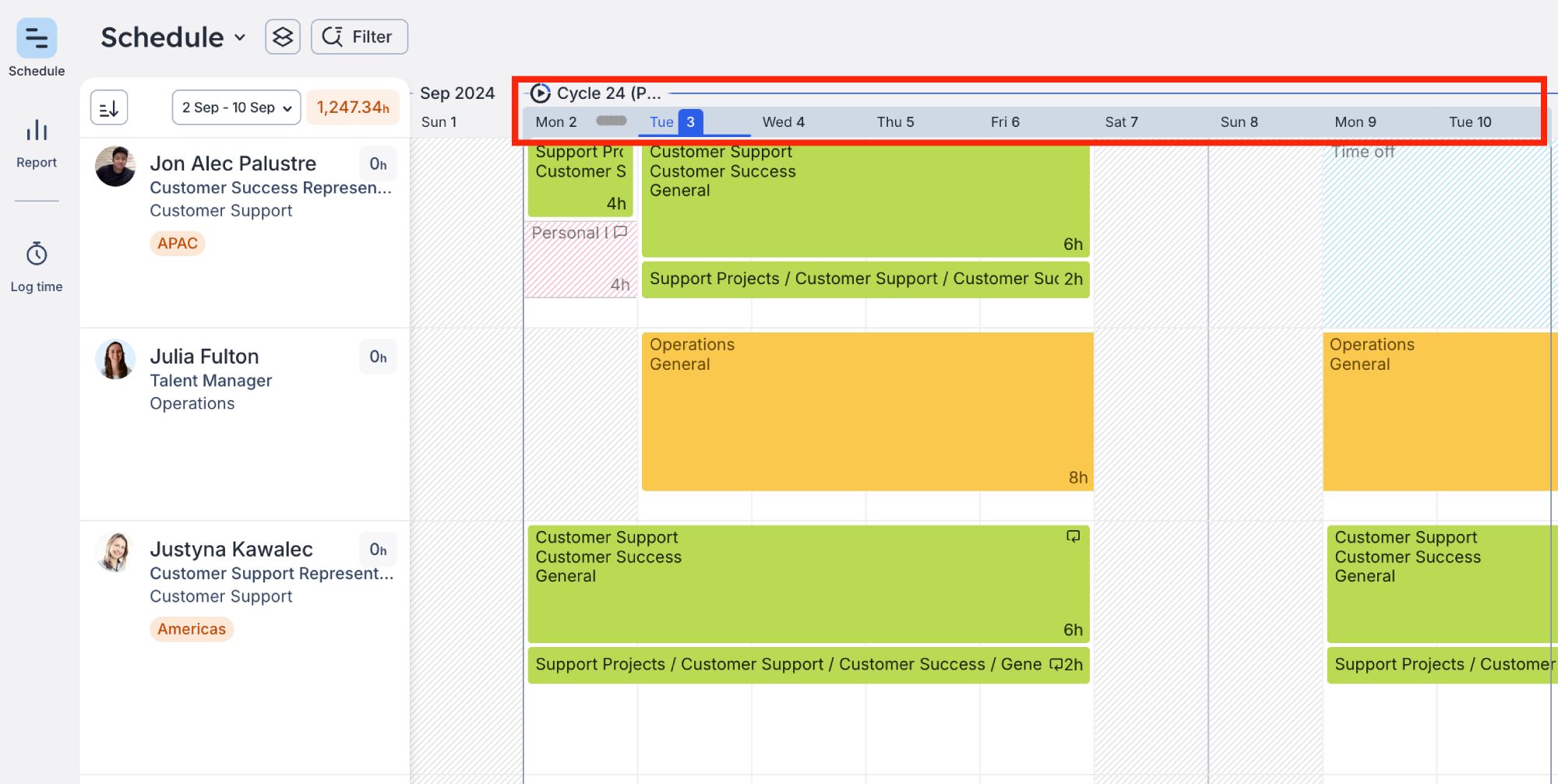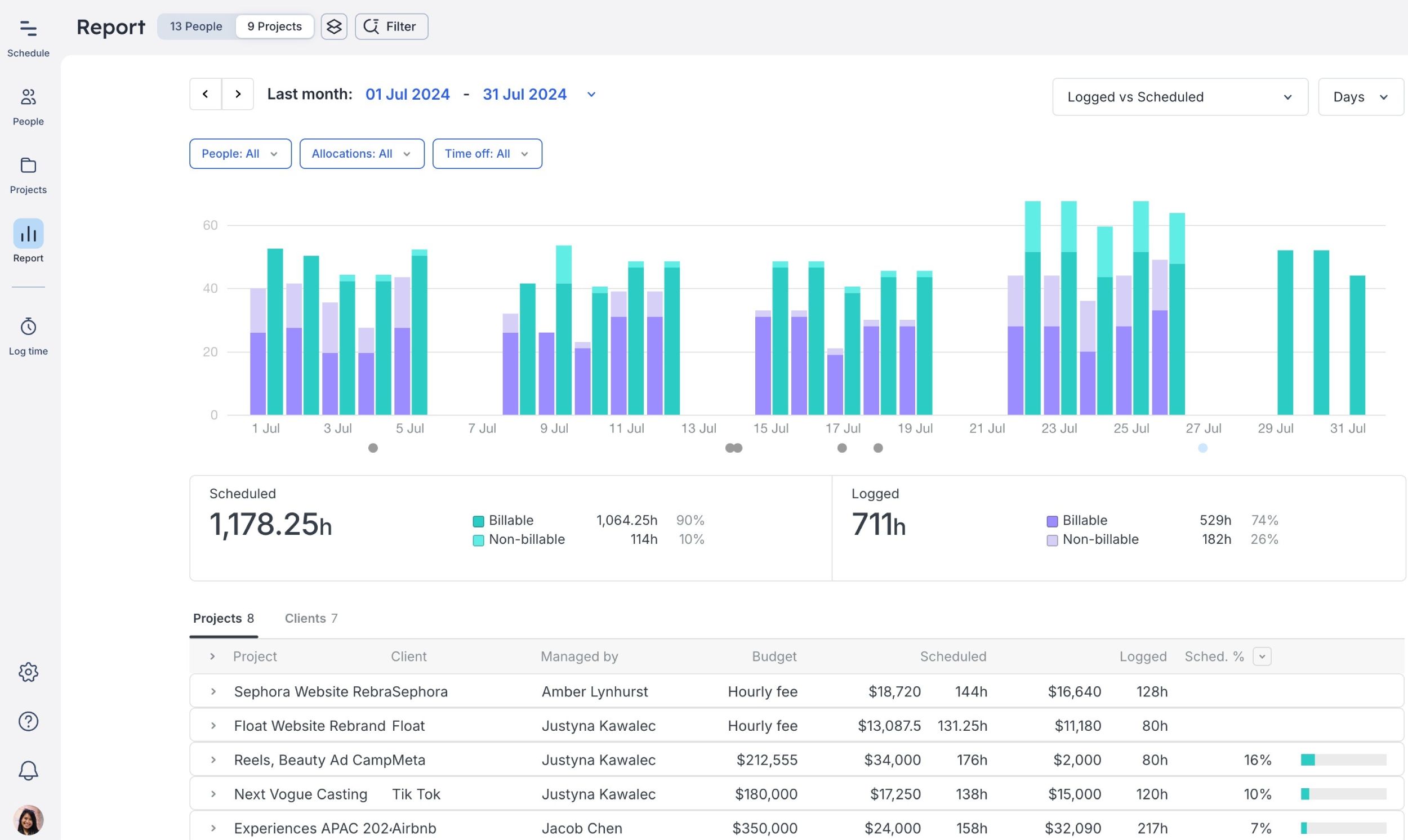 If your team uses time tracking, you can also see when a project is taking longer than expected by comparing actual logged hours with scheduled hours.