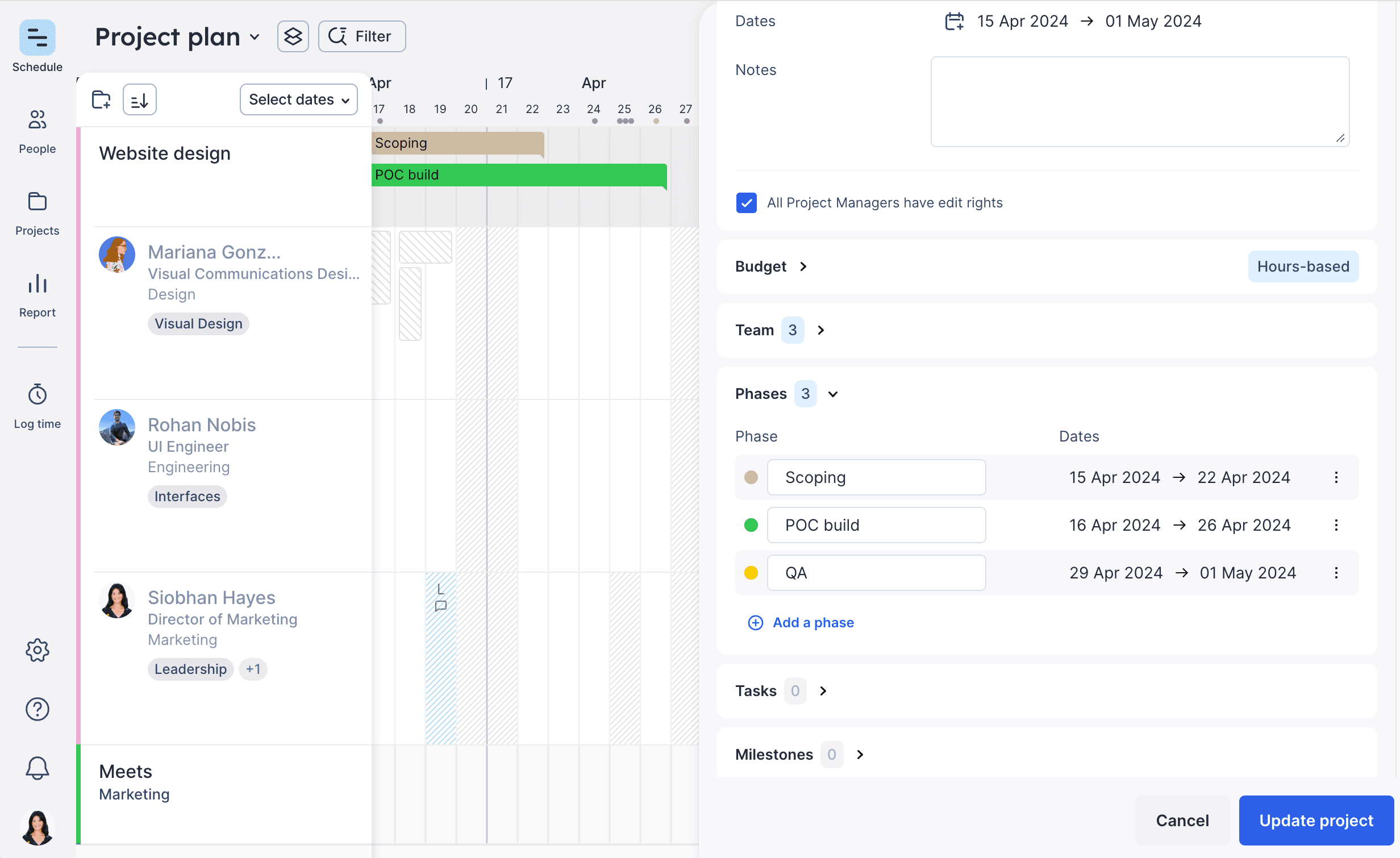 If you need to edit a phase duration, that's easy too. Simply edit the number of days in the project side panel.