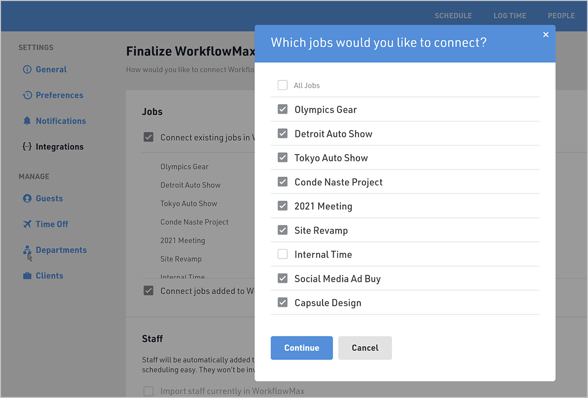 You can choose to import all of your existing staff and jobs from WorkflowMax, or select just the ones you want to schedule in Float.