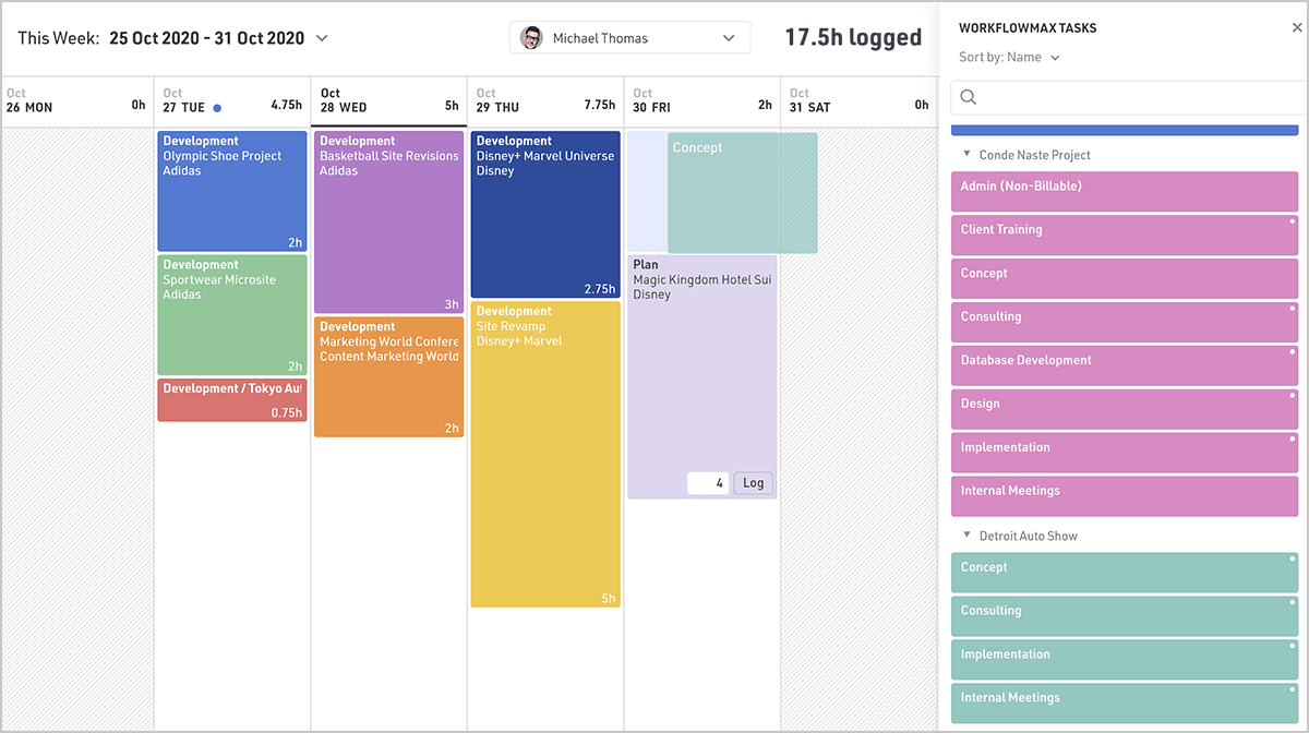 Time tracking works with the WorkflowMax integration as well. When you drag and drop a task onto the Log Time page, the time is submitted in Float and available for review in your reports immediately.