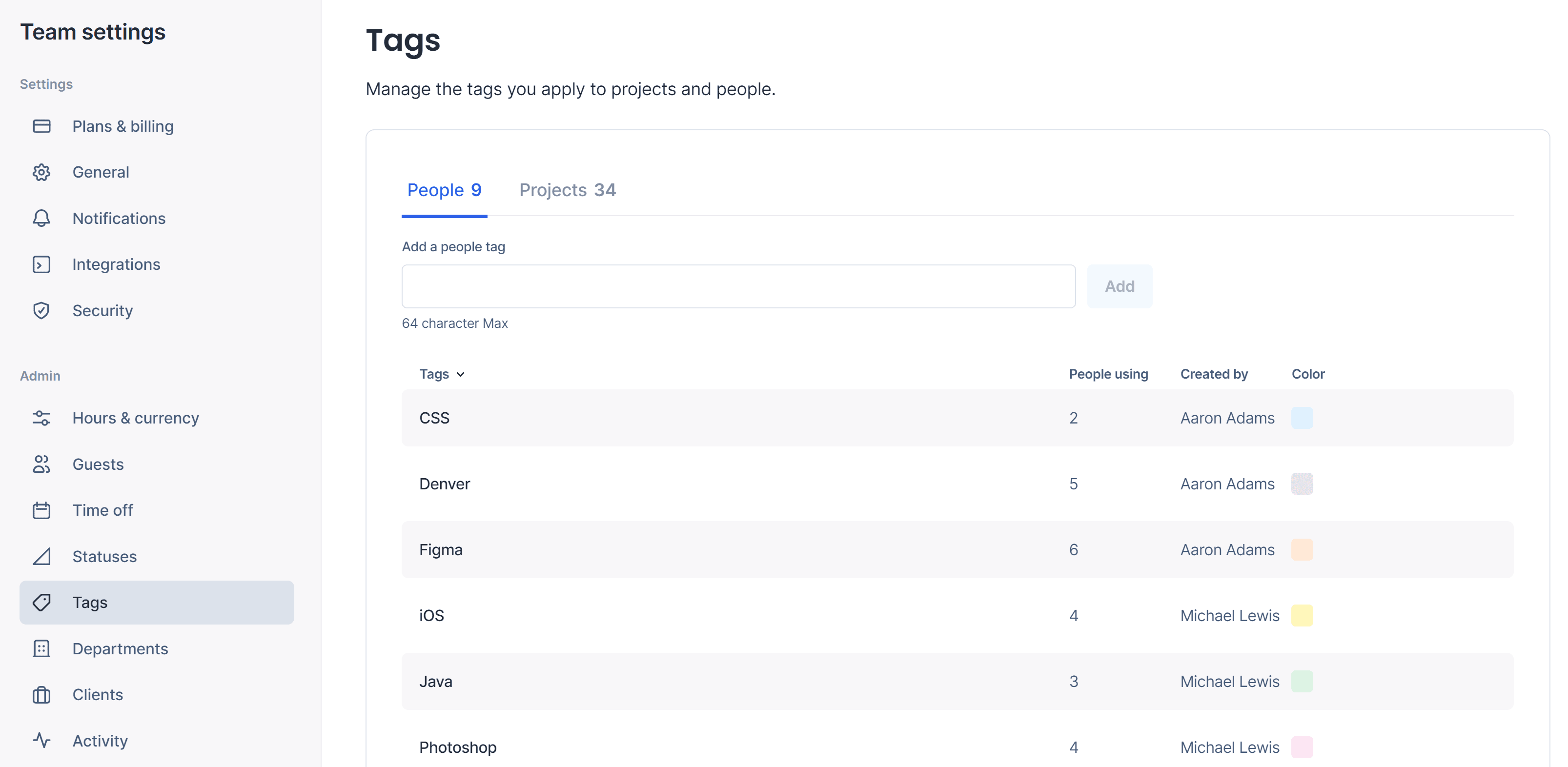 Create new tags, assign them a color, and see who created what from the redesigned Tags tab within your Team settings.