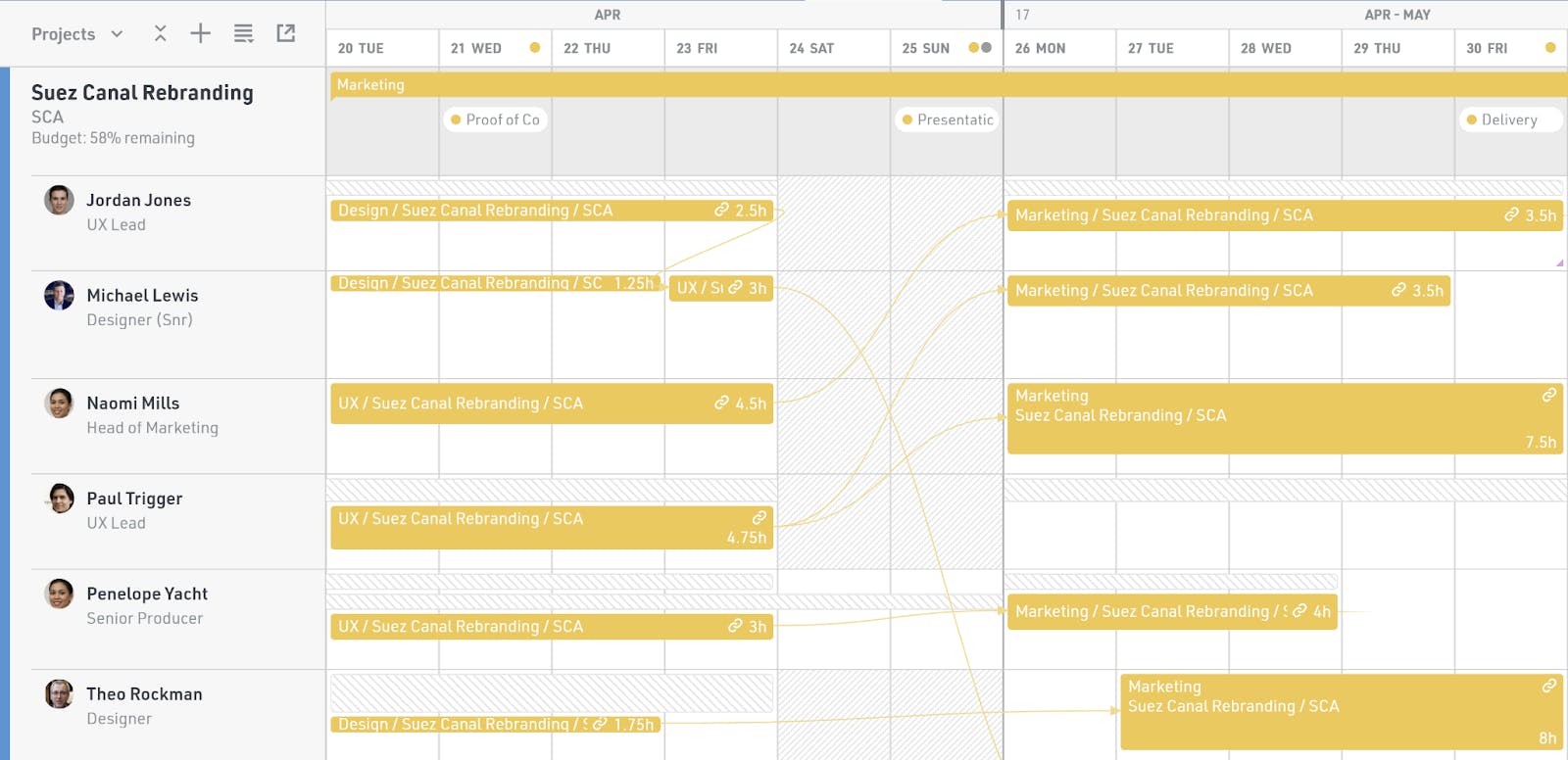 Here's where a tool like Float can come in handy. You can add project timelines to track progress and key deadlines. It also makes it easy to set a project budget to forecast delivery and track spend in real time. But more on that later.