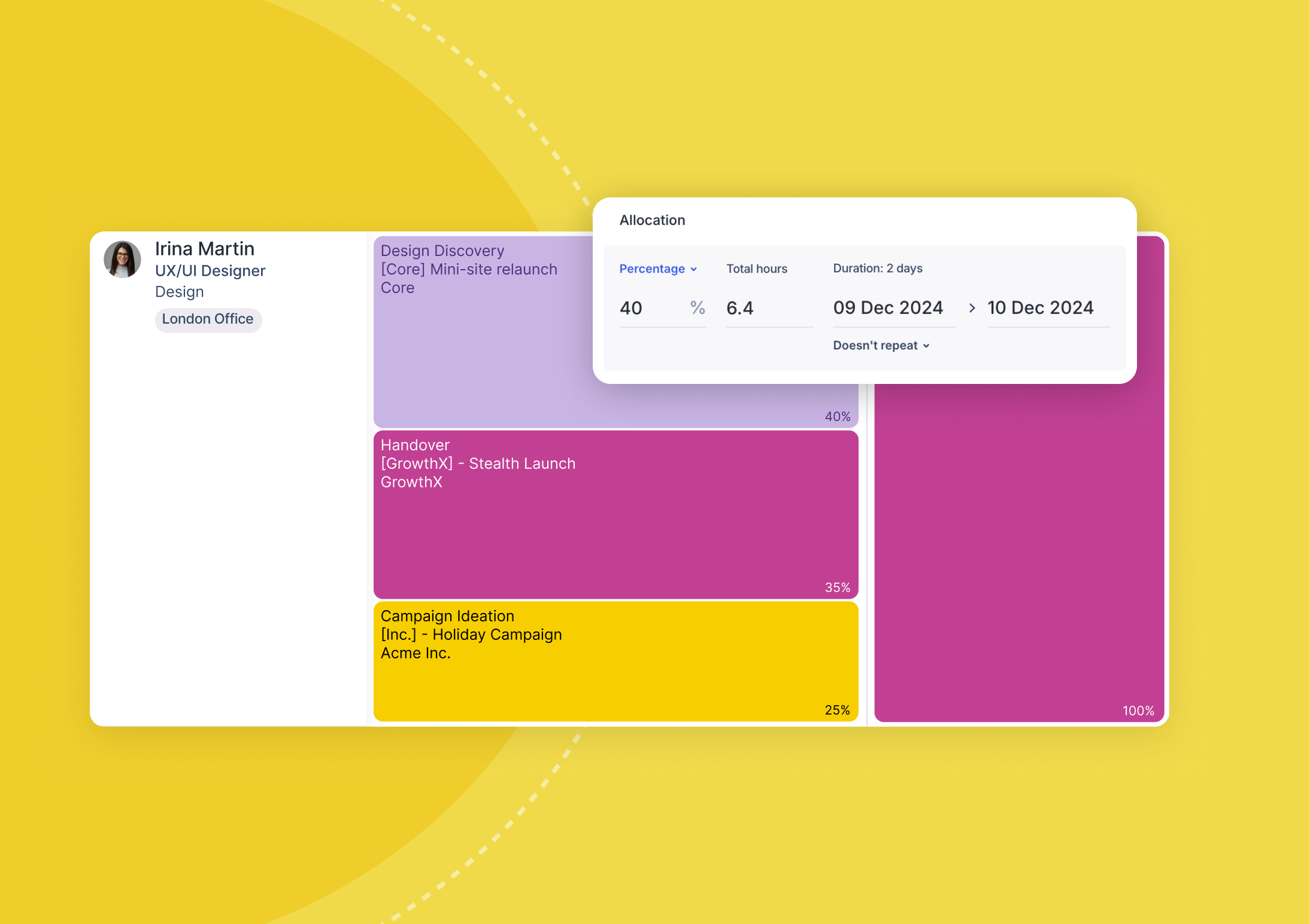 Schedule allocations in percentages for enhanced flexibility when working on high-level planning or booking in general time blocks.