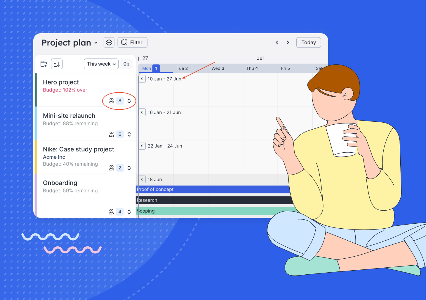 Get a quicker view of what you need to know when planning work—with total people and start and end dates added to the Project Plan. See how many people are on each project and click the project dates to jump forward or back to that point point in time. Voila! It's more info in fewer clicks ✨