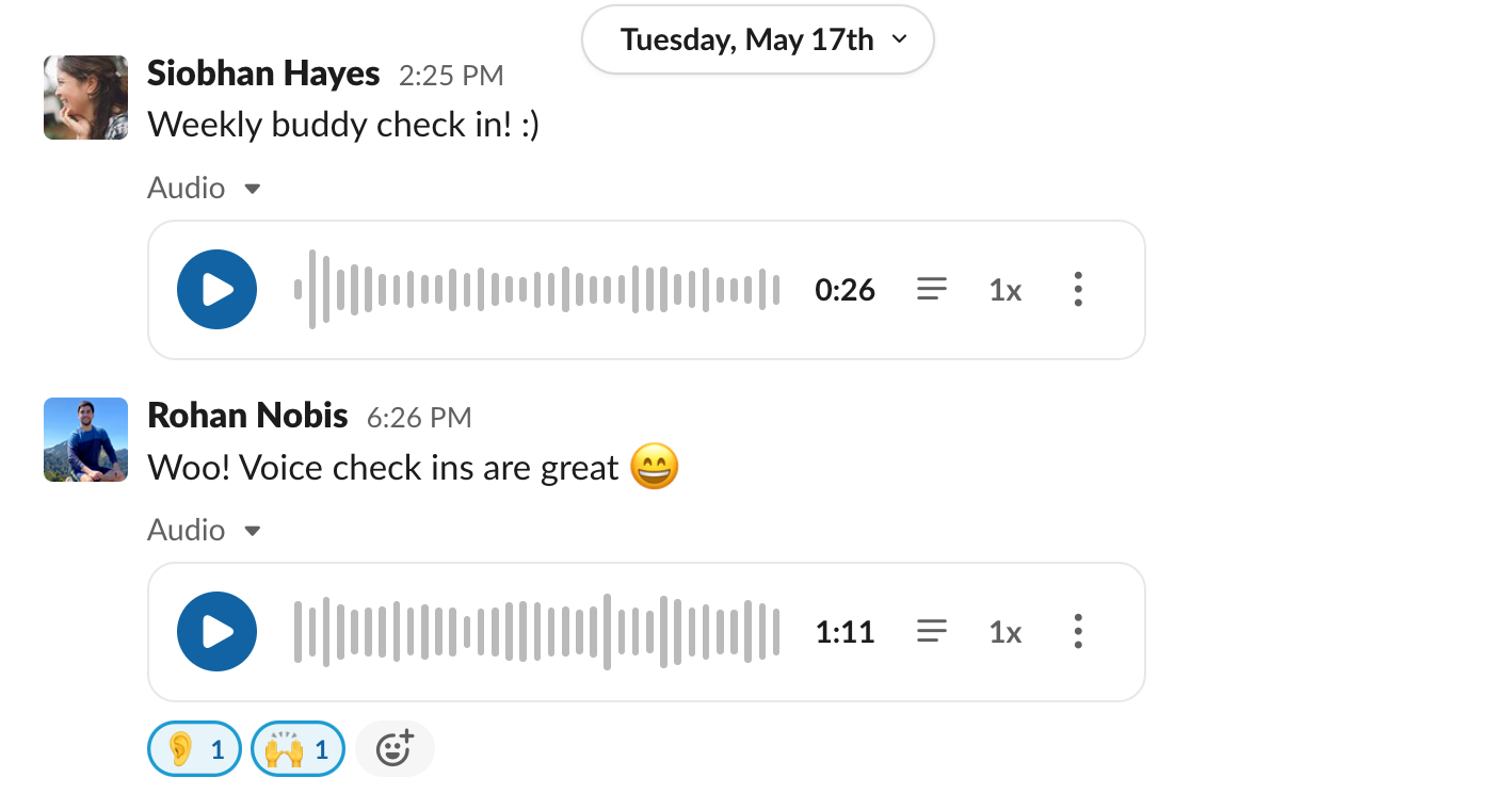 - Sending a voice note or video message via Slack. Instead of always sending direct text messages, this is a nice way to mix up how we communicate.