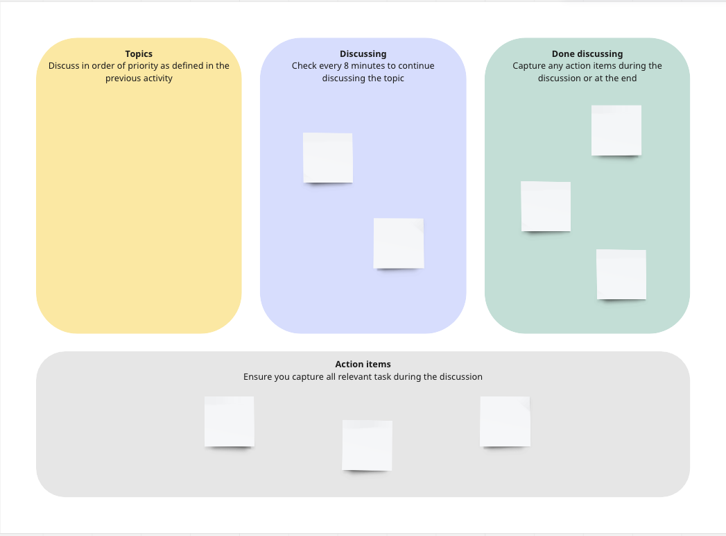 To facilitate discussion, I turned to a favorite meeting tool of mine: lean coffee. It's a simple discussion format that creates a level playing field to prioritize and discuss topics anyone can suggest. We set up several large pieces of butcher paper labeled Topics, Discussing, and Discussed. Team members had a chance to reflect and add sticky notes for consideration to the Topics page, and then we voted on the order of discussion for the rest of our time.