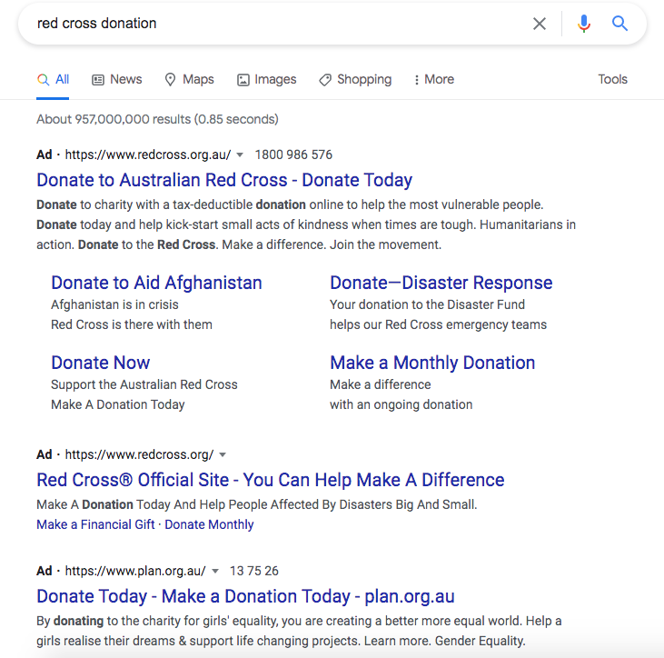 Google doesn’t have a policy that protects brands from these types of practices either. If I search for “Red Cross donation,” it doesn’t give me confidence of how my donation money will be spent when I see charities beholden to bidding on their own brand names too.