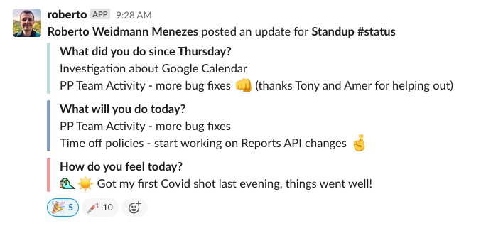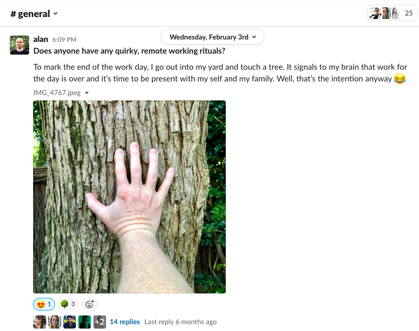 We have found that this daily ritual of sharing what we're up to has nurtured an open, inclusive, and supportive Slack workspace. We don't have expectations on how everyone responds—happy photos, emojis, brutally honest negativity—it's all welcome, and it's all there!