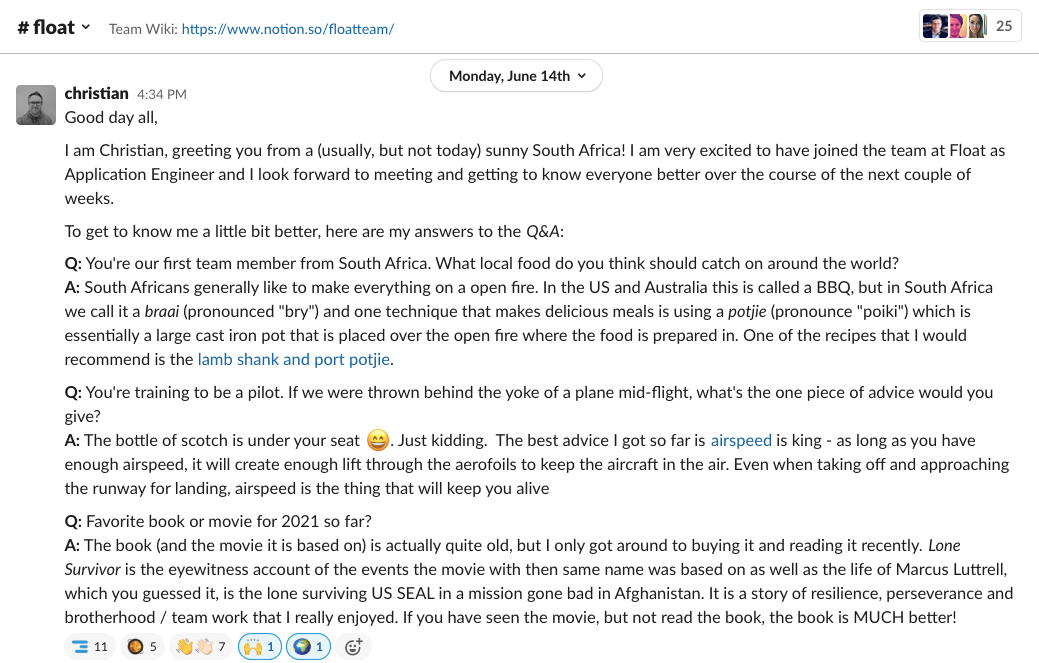 On day one, they post their answers to our #float Slack channel and introduce themselves. We've found that this tradition (we've done it enough times to call it that now!) helps us engage on a more human level right off the bat and provides our team with more "more than work" reasons to connect.