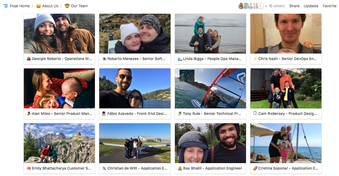 Our team page in Notion provides a "who's who" across the business. Everyone has a profile page that covers their role at Float and gives a window into their home life and hobbies.