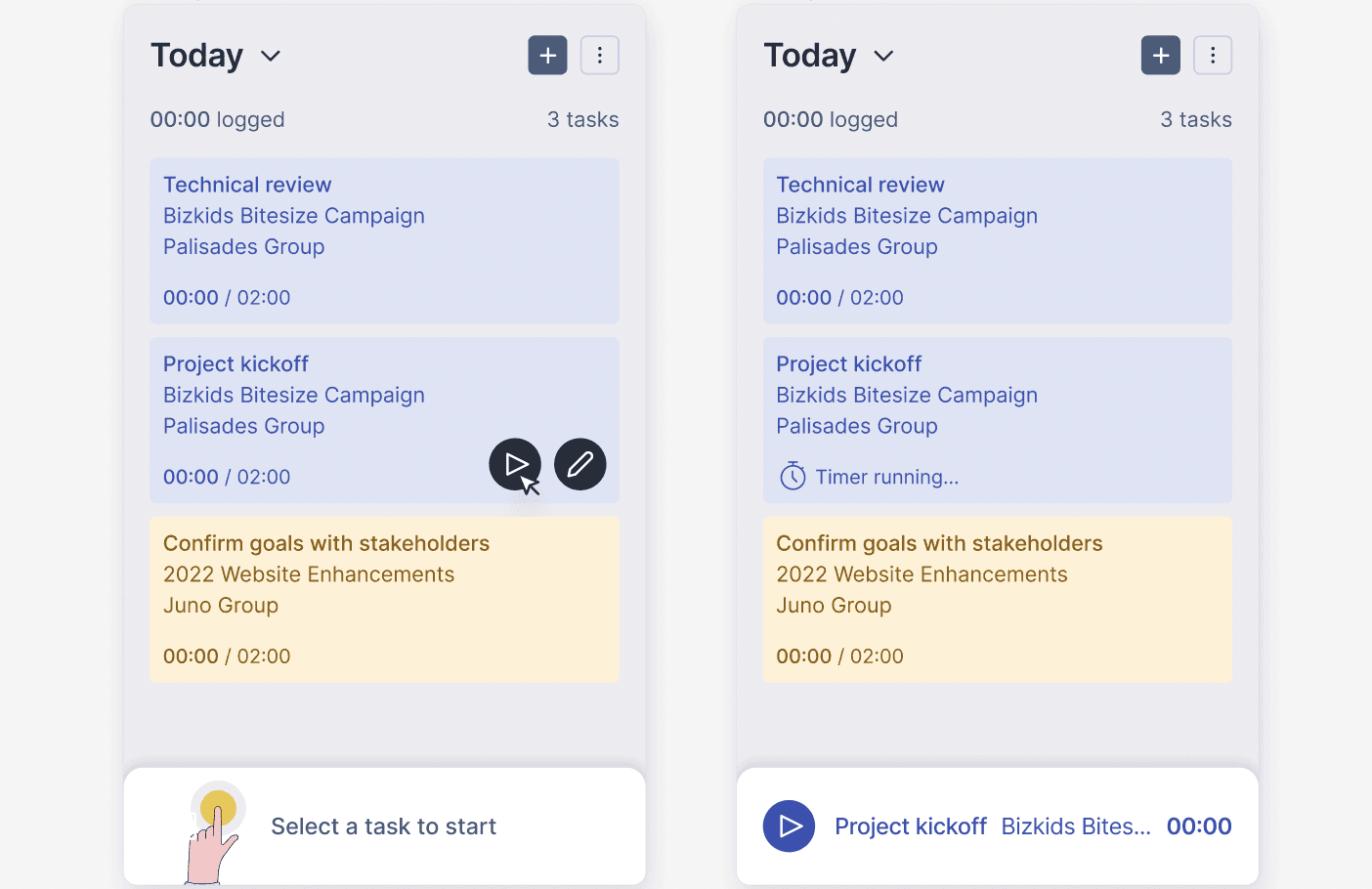 With the Windows or Mac desktop task timer installed, you can see and start the timer on all your planned tasks for the day with prefilled project and client details. (Unplanned tasks can also be added and timed as needed.)