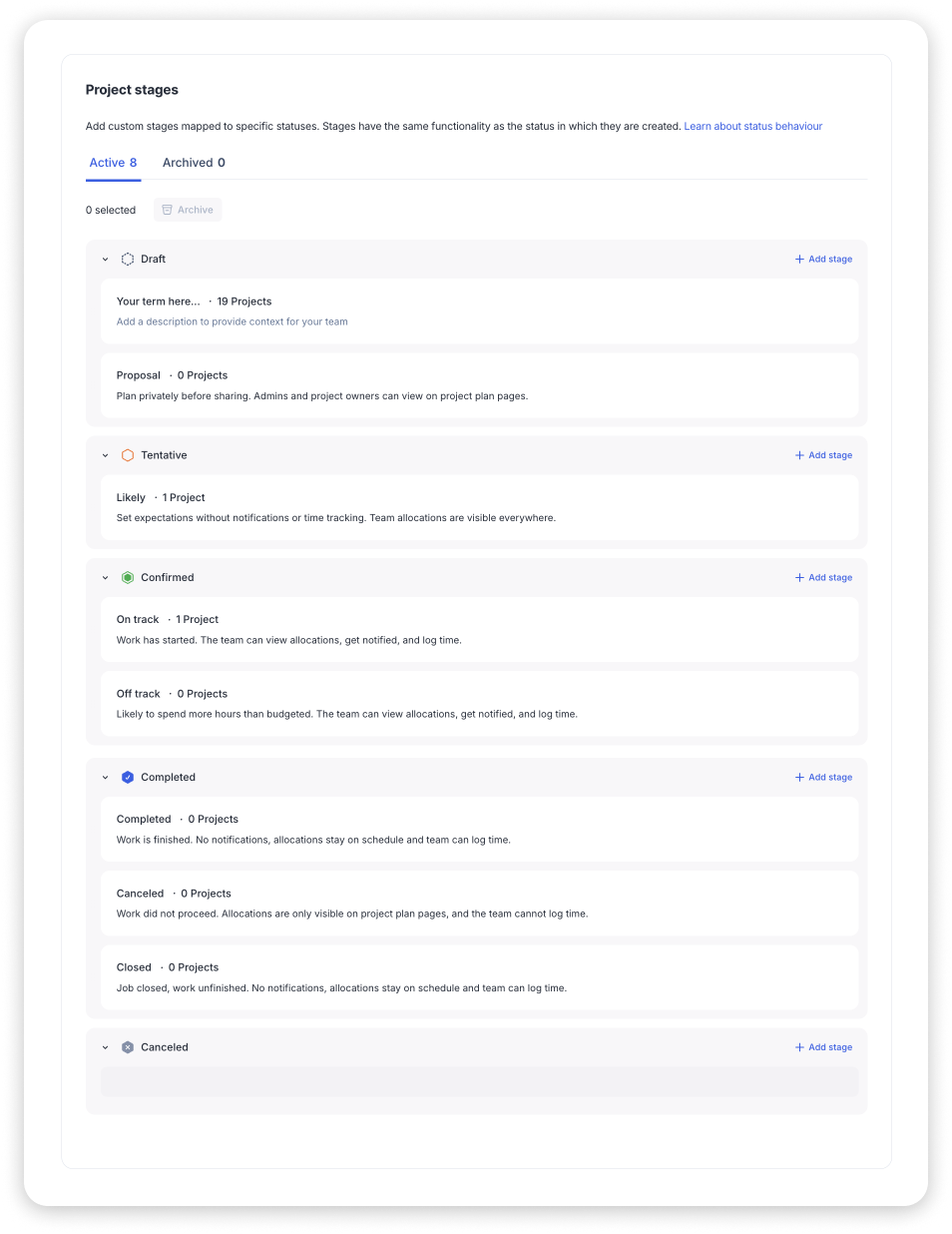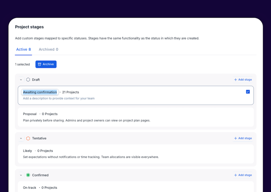 Your project stages are like custom labels for your project work. They let you add more nuance to each of Float’s existing project statuses (draft, tentative, confirmed, etc.), helping your team quickly understand where a project is at in its lifecycle.