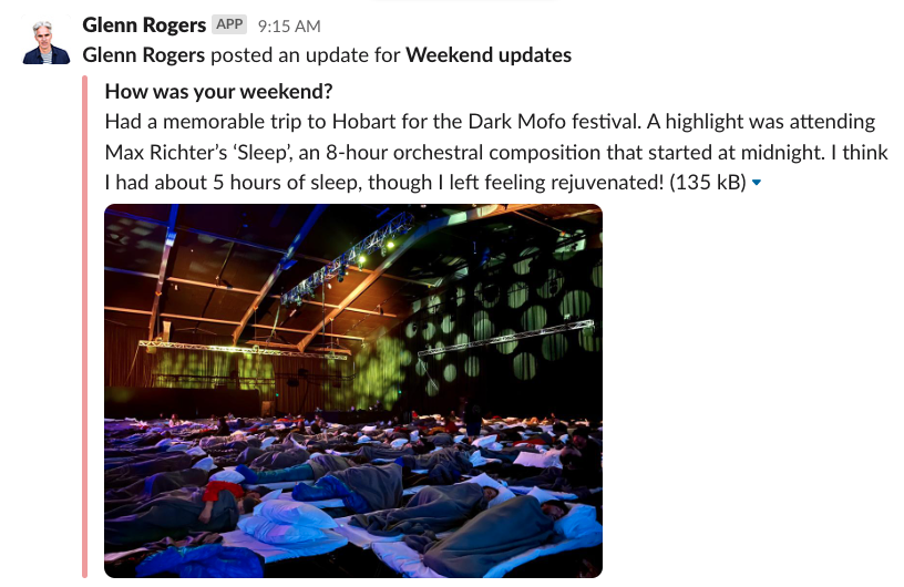 - Reminders and reporting of time off: Managers are reminded to check in in on their team's time off usage as the year progresses and our ops team will send a nudge as well! In operations, we see time off usage as a measure of how we, as a company, are performing. For example, at the end of June, we would expect that our team has used around 50% of their time off for the year. We were pretty chuffed that our recent check in found that our team has used 55% 😉. We also have set up prompts in Slack for folks to share photos and written updates on how their time off was spent, which is mostly a way for us to socialize but it also reinforces the behavior of acknowledging and encouraging time off usage.