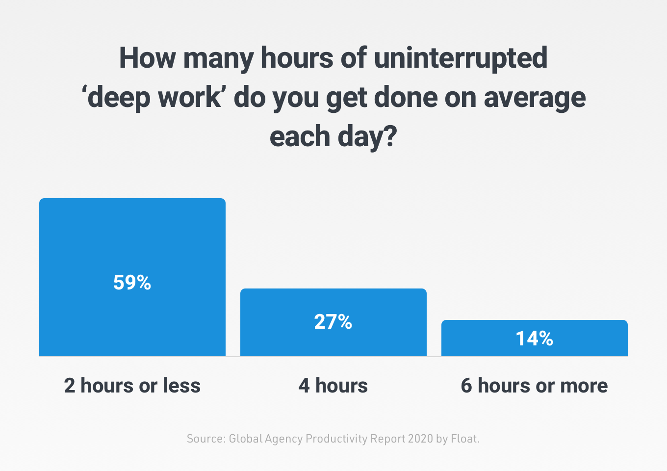 A majority of team members surveyed (59%) manage only 2 hours or less of deep work each day. "Deep work" is defined as the opportunity to focus on valuable work without interruption. With the average workday lasting 8 hours, this means that on a daily basis, only a quarter of their time is spent on meaningful, quality work. Small to medium-sized agencies (30 or fewer employees) are less likely to be distracted from their daily workload, with 60% of employees reporting they are able to get through at least 4 hours of deep work each day.