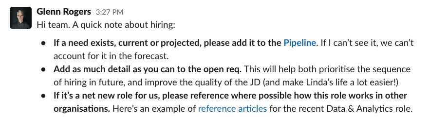 Our average time to hire, from establishing that a role is required, to the candidate’s start date, is about 90 days. When you’re thinking about growing a team, you must be thinking about your needs 90 days out.