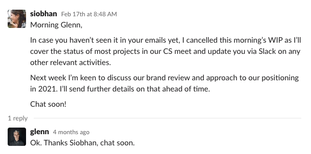 A simple and actionable rule of thumb for us at Float is that we don’t have meetings for the sake of meetings. This applies to our weekly status meets too. If there’s nothing to discuss that week, we cancel, and there’s no shame. In fact, we usually thank the other person for respecting our time and giving us 20 minutes of our day back!