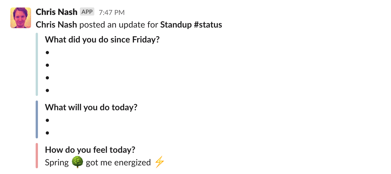In being respectful of our team's time and wanting the process to be as simple as possible, almost all of our avenues for checking in our team members are through Slack apps. We have purposefully set up our channels as department teams and broader teams.