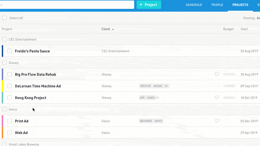 Or change the client, color, project type, tags, budget, PM access, and owner of multiple projects at once.