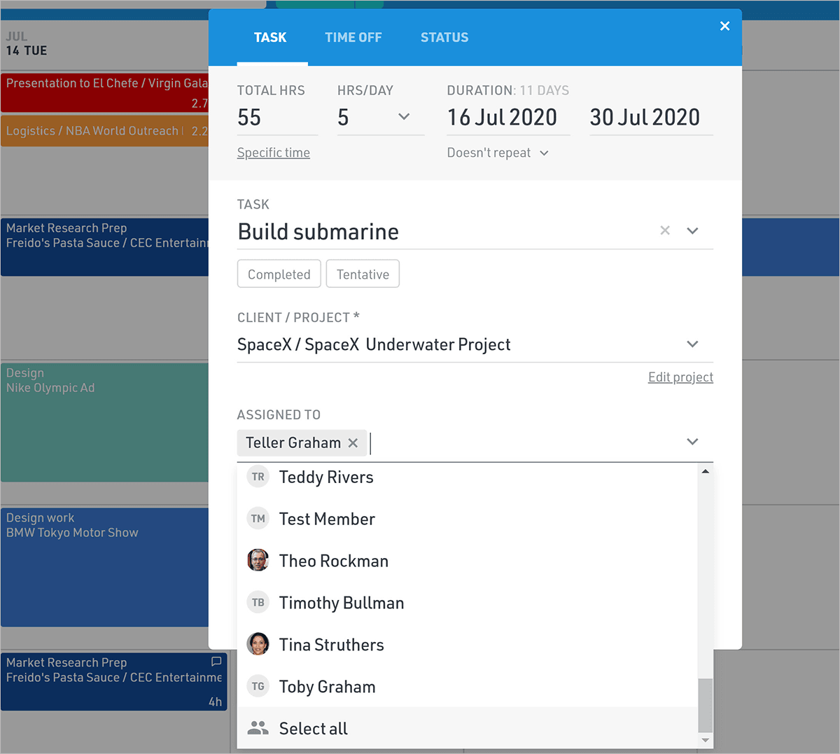 Simply bring up the task menu, enter the details, and click the Assigned To field to select the team members you want to schedule.