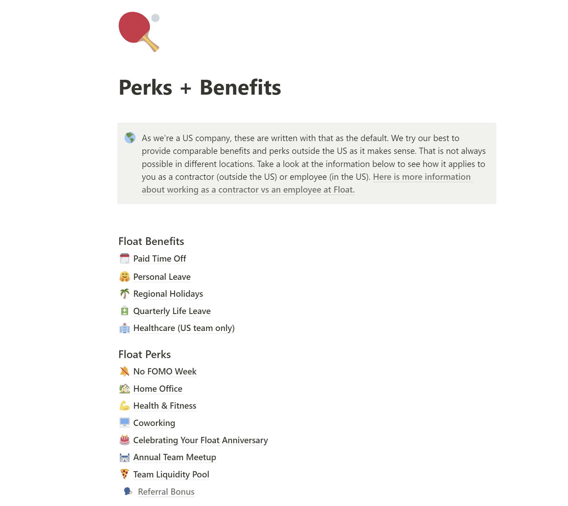 We initially made a copy of our Perks and Benefits page public to ensure potential team members had all the information they need. This helped make sharing the info with candidates easier, and we were able to include it in offer letters.